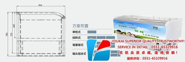【LD-B型弧面冷凍島柜特點】:選擇優凱冷柜-十大優勢。 ■采用整體高密度發泡,全封閉玻璃結構,保冷性能好,節電。 ■采用制冷系統及人工智能控溫系統,冷凍、冷藏兩種溫度相互轉換節能; ■堅固牢靠的鋼架基礎,加上粉末噴涂鋅鋼板外飾表面, 使柜體既持久耐用,又美觀大方; ■強勁制冷,五面盤管,急速制冷,運用高能效比環保型冷媒R404A,節能30%。 ■超大容量設計,可代替小冷庫,方便實用; ■豪華大方的外觀設計,色調采用柔和的灰白色及乳白色,現代感強; ■低噪設計:優化的設計,讓您基本上感覺不到內置式機組的噪音。 ■采用鋼化鍍膜熱反射透明防凝霜玻璃門,隔熱保溫,展示效果。 ■柜體帶萬向輪,便于移動。 ■款式色彩靈活定制。 【產品參數】: